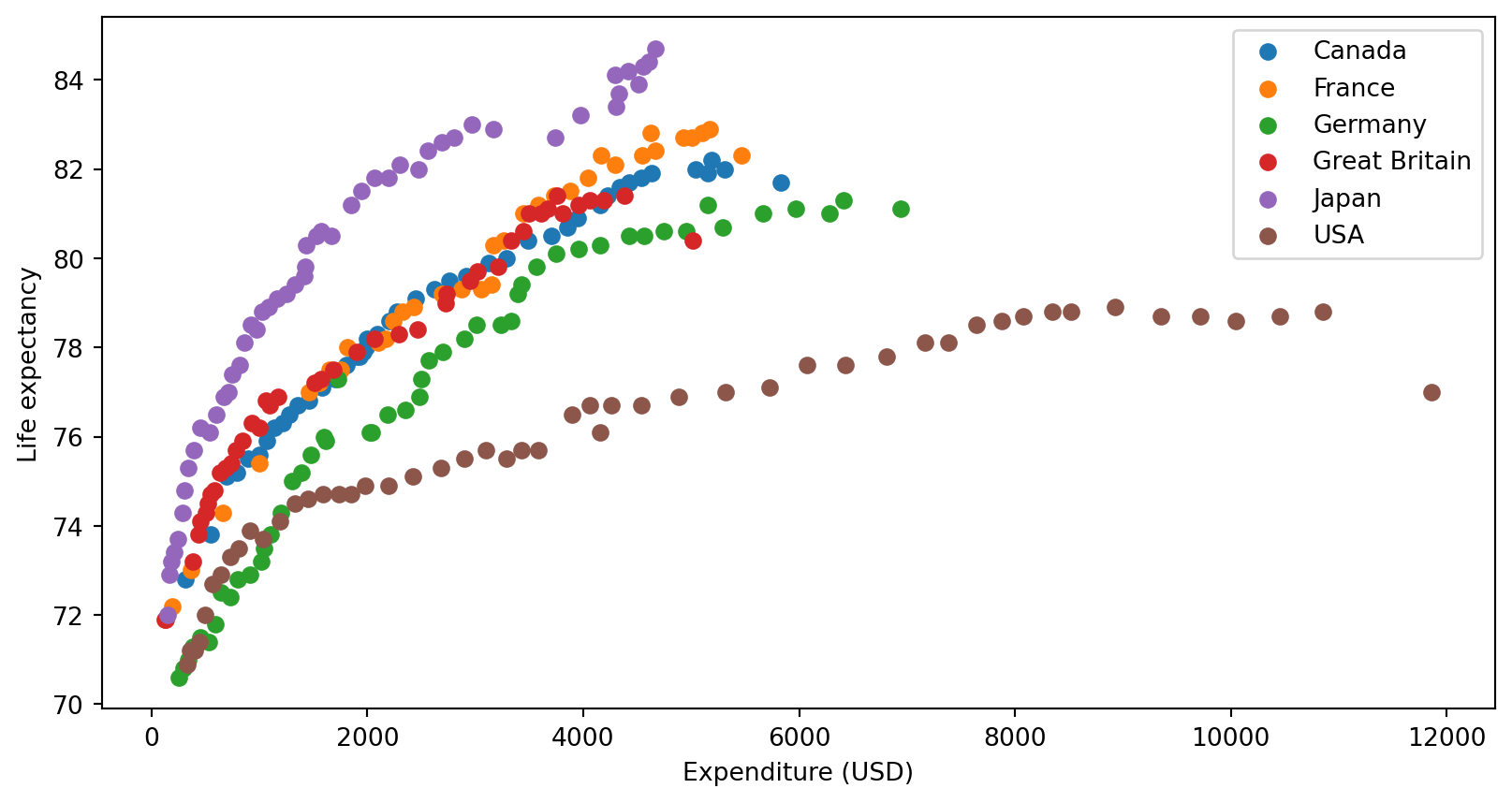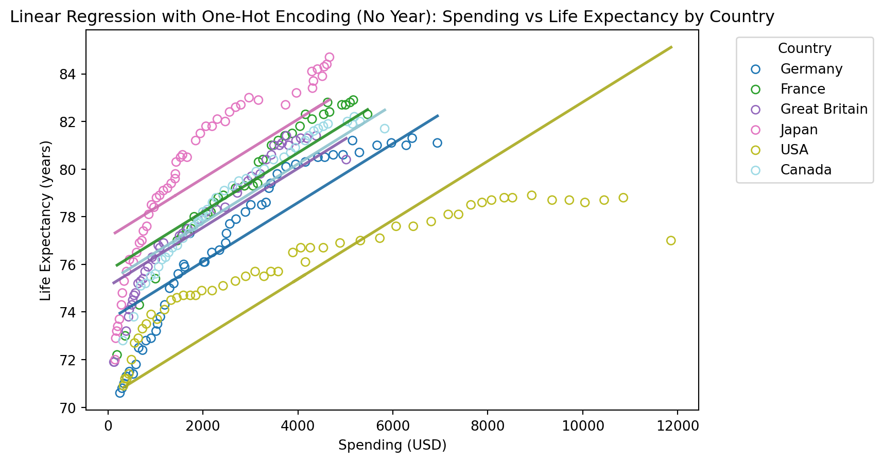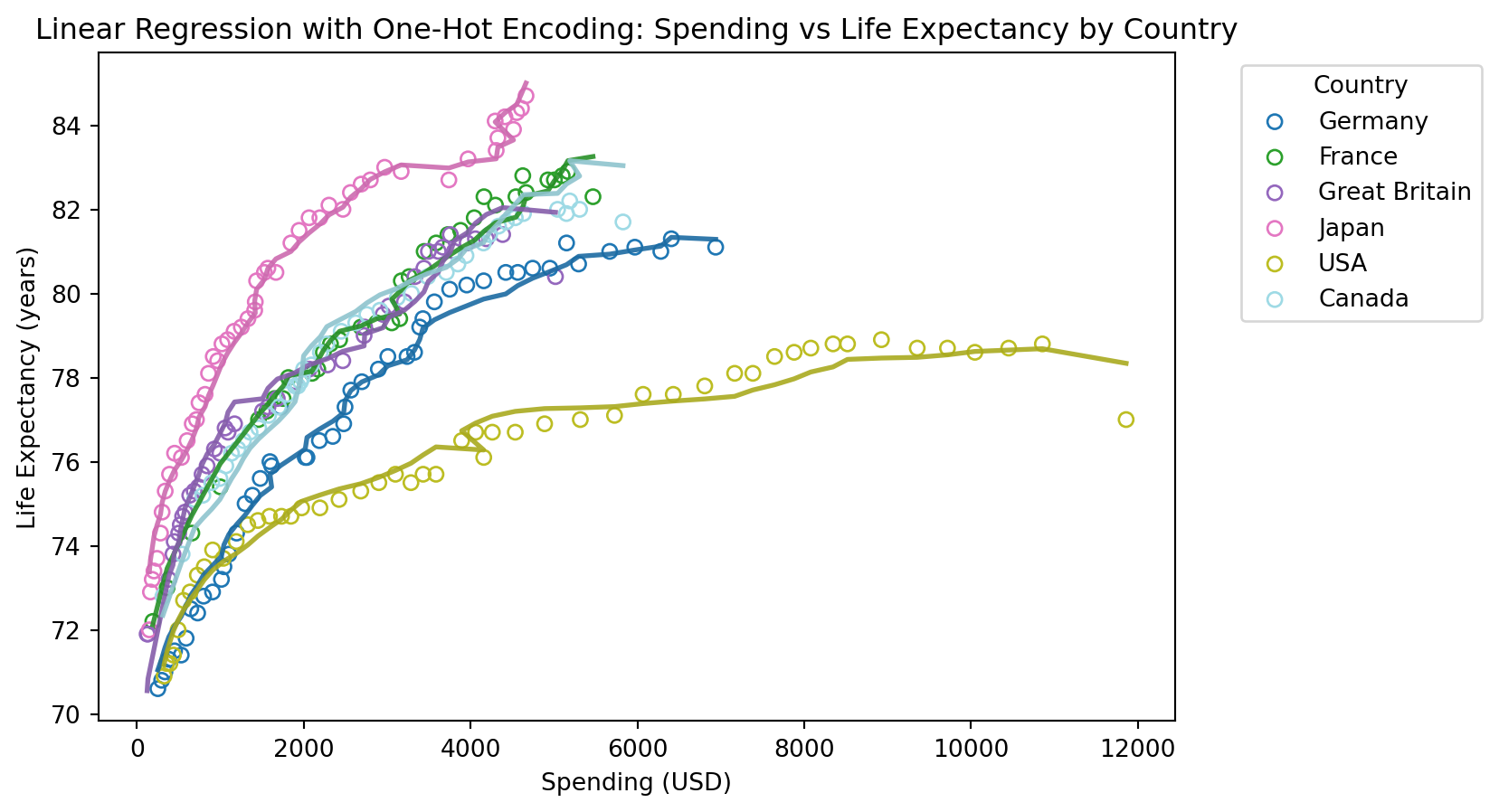 display(health_onehot.sample(10))| Year | Spending_USD | Life_Expectancy | Country_Canada | Country_France | Country_Germany | Country_Great Britain | Country_Japan | Country_USA | |