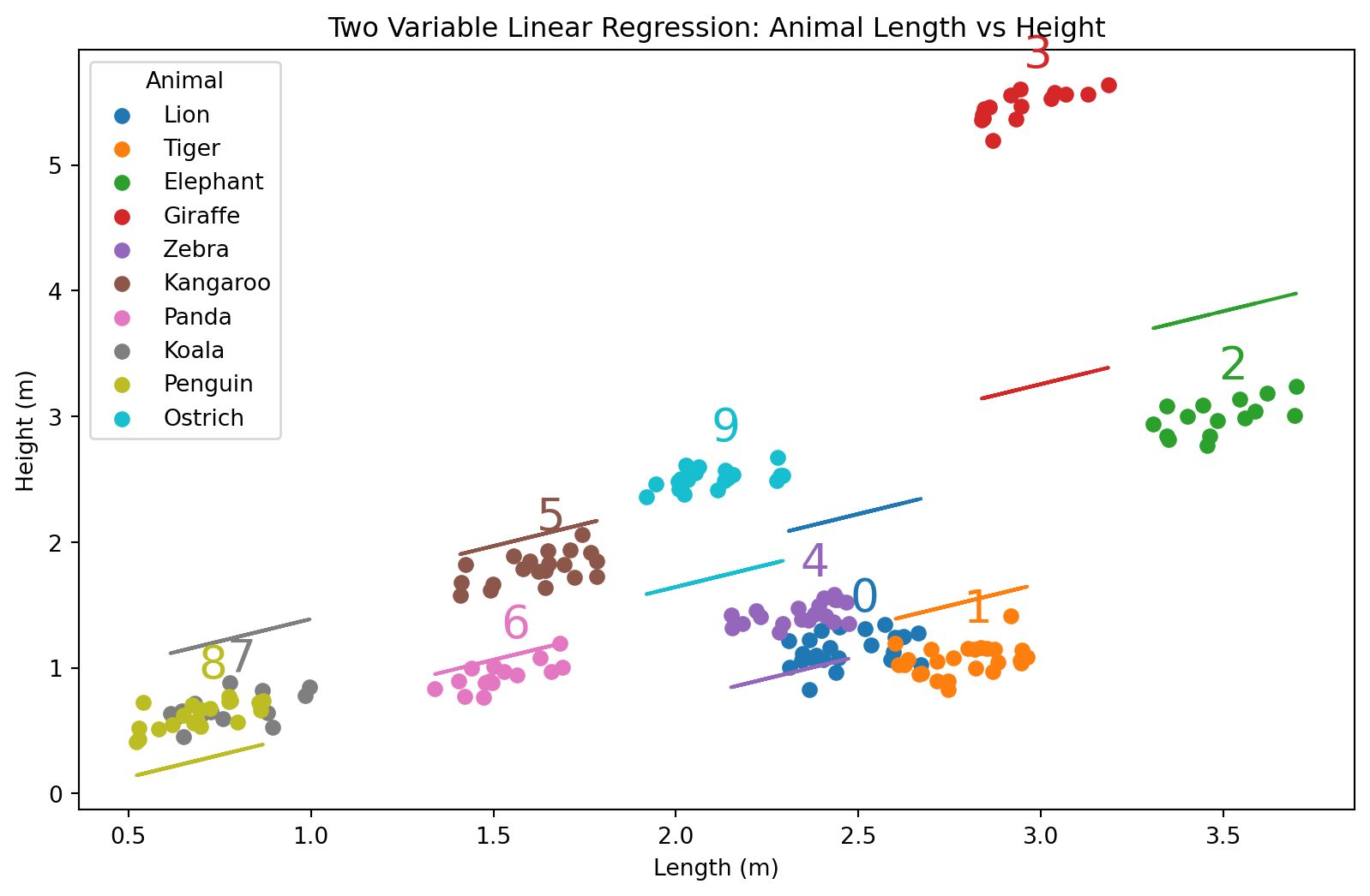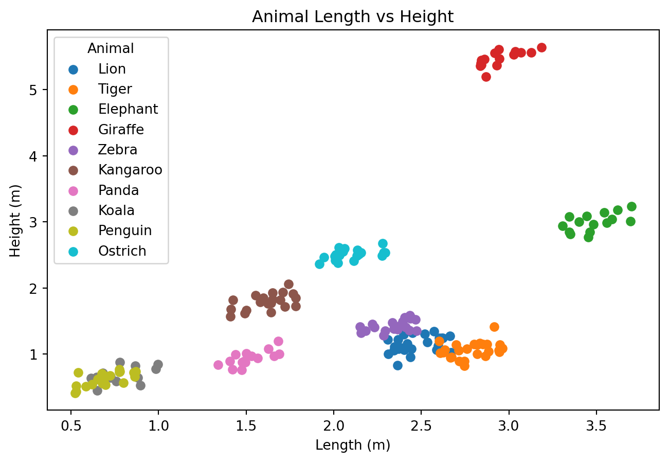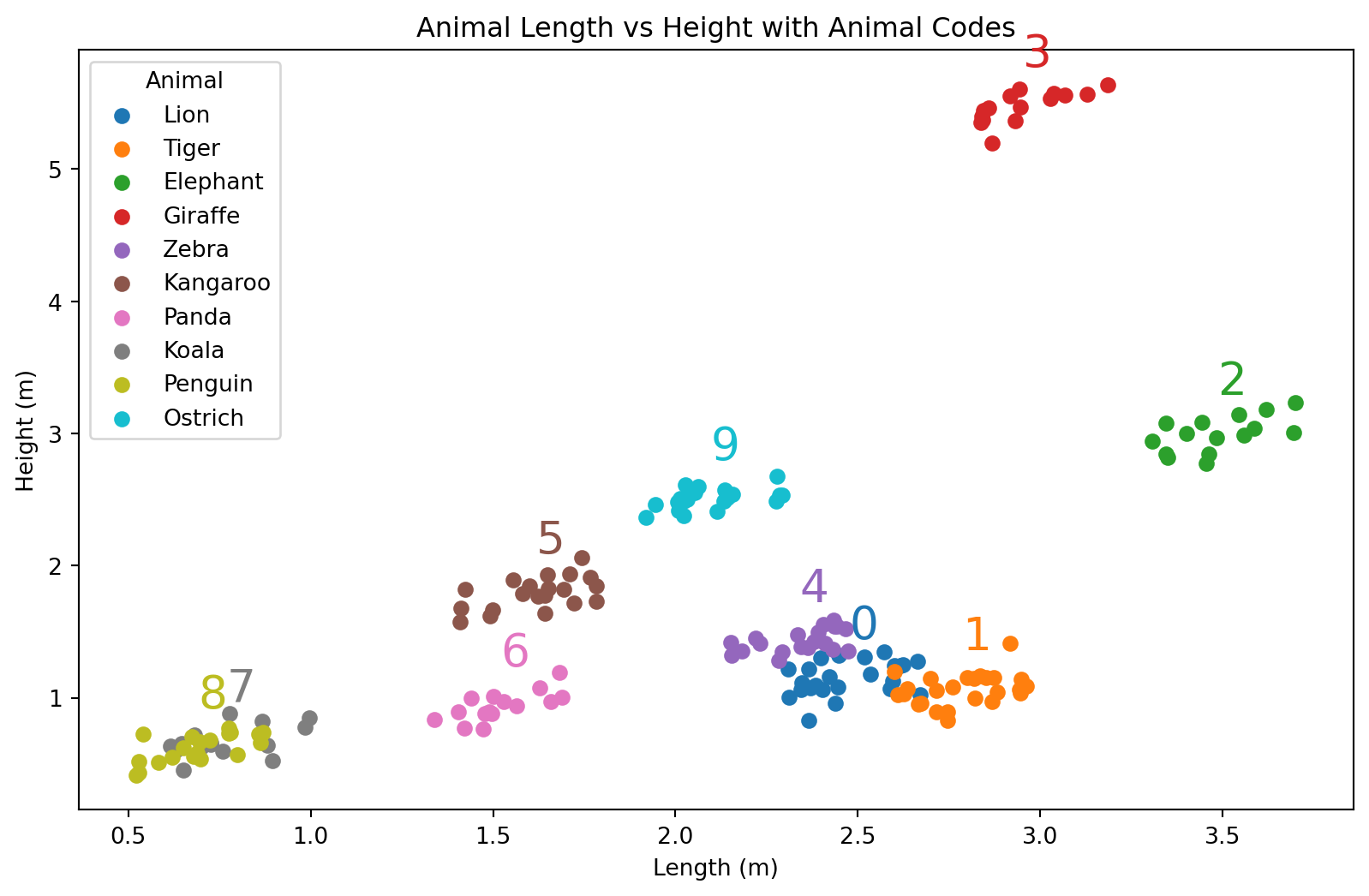| Length | Height | Animal_Code | Animal_Elephant | Animal_Giraffe | Animal_Kangaroo | Animal_Koala | Animal_Lion | Animal_Ostrich | Animal_Panda | Animal_Penguin | Animal_Tiger | Animal_Zebra | |